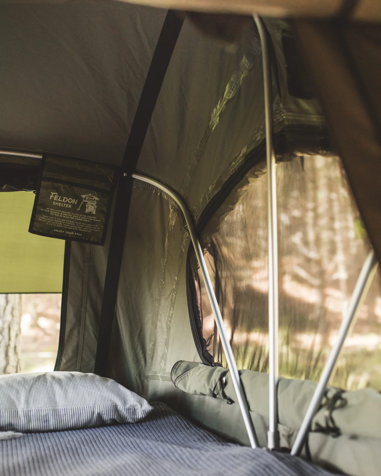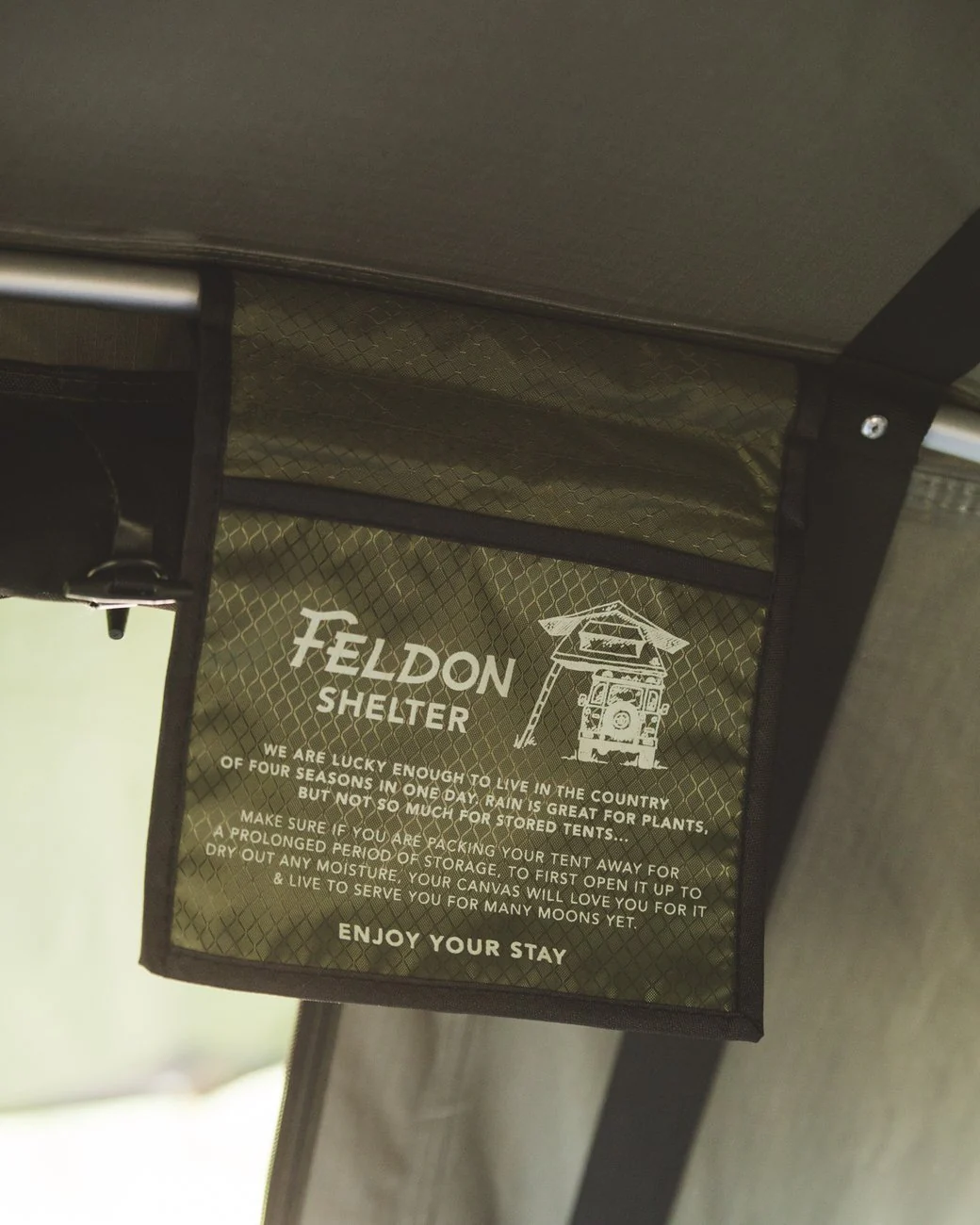 Feldon Shelter’s uniquely curved roof prevents annoying water pooling and those unsuspecting roof showers. These curves mean smoother aerodynamics so even the strongest of winds are no match. We’ve given extra attention to keep your nest cosy and dry by specially waterproof treating our canvas, using waxed stitching and taping all seams.